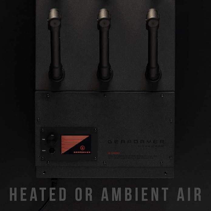 • HEATED OR AMBIENT AIR and CUSTOMIZABLE TIME SETTINGS. GearDryer heats the air temperature approx. 35 degrees above ambient air temperature for gentle drying and warming and allows for timed drying options from 15-minutes to 24-hours