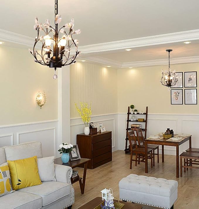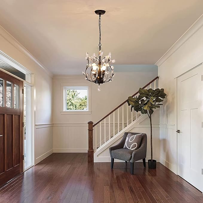 - ARTIST DESIGN: Black crystal chandelier use 5 branches with crystals design to increase the line sense of fixture, beautiful shape and strong artistic design give you a unique choice,use transparent glass crystals to capture and reflect the light of the bulb. Black, Gold two colors for optional, sparking and stunning crystal to created a warm and soft atmosphere.