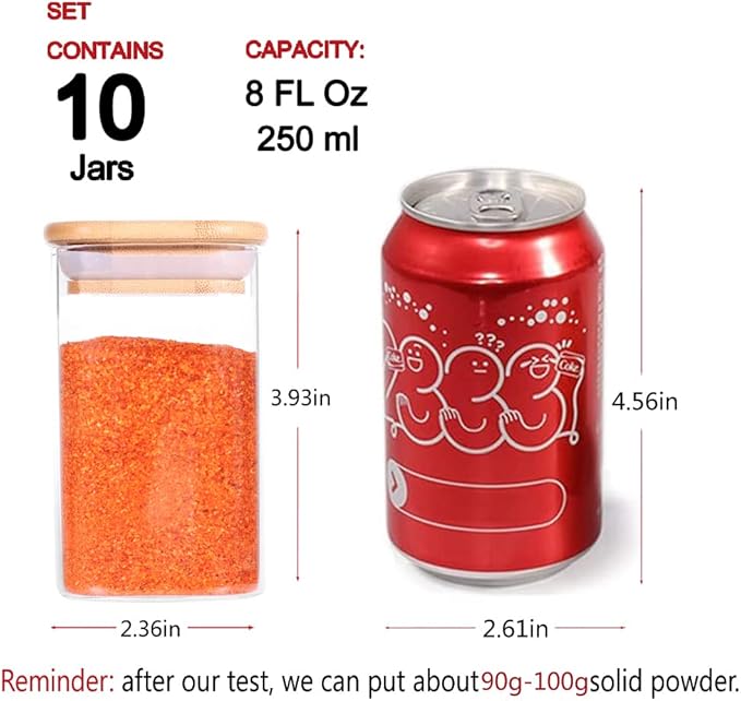 - 【MULTIFUNCTION】Use our square empty glass jars for organizing seasoning, storing spices, salt, pepper, herbs, DIY projects, and more! These mini glass jars have a variety of uses such as party favors, craft or office supplies, decorative projects or homemade goodies.
