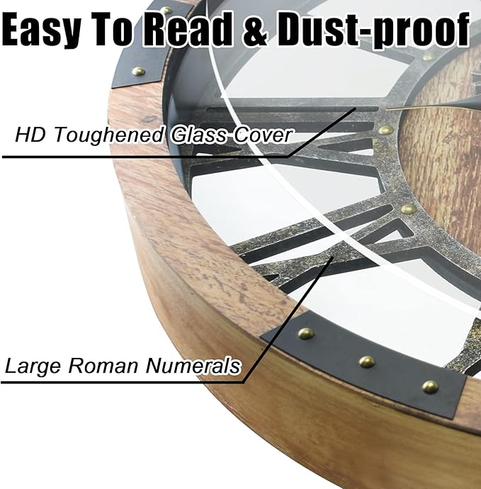 - 🧭【Oversized and Silent Movement】 This giant farmhouse wall clock measures 26.77" (68CM) in diameter, 3.15'' (8CM) in depth, weight-12.56lbs (5.7kg), extra large size and heavy duty. Using high quality quartz movement material to run smoothly, ensuring accurate timing and absolute silence. Big Roman Numerals, HT toughened glass cover, you can easily read the time from any angle.