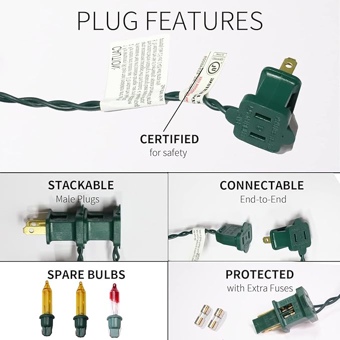 - Product Nature:Each mini Christmas light set comes with end-to-end plug, can be connectable up to 5 sets (500 lights). Each bulb space 2.5in, 2.5V and 0.425W per bulbs, built-in 3A fuse for safe use. Extra bulbs and fuses are included.