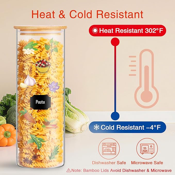 - 【Label & Stack System】Stay perfectly organized with 58 colorful labels included with these kitchen jars. The uniform glass pantry storage containers set with airtight bamboo lids stack neatly to maximize space - ideal for small kitchens storing flour, nuts or pet treats.