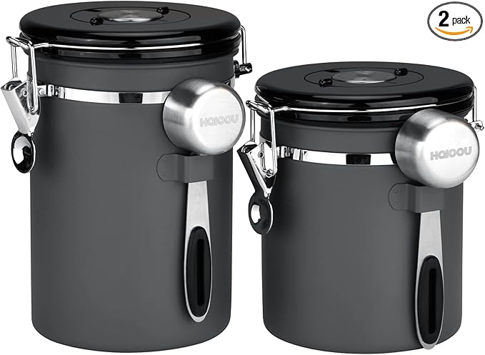 HAIOOU Airtight Coffee Canister, 22OZ +16OZ 2 Piece Stainless Steel Coffee Bean Storage Container with Date Tracker, Measuring Scoop, 6Pcs CO2 Valves, Mini Tongs for Coffee Bean, Grounds - Grey