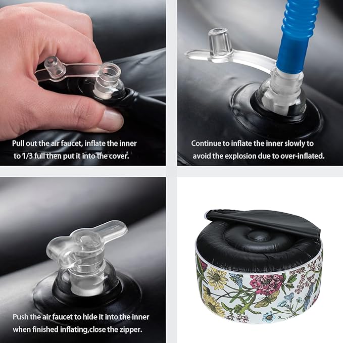 - 【Package Included】-You will received a flat hand-held storage bag inlclude 1pc black inflatable ottoman pouf inner measures D20"xH9", 1pc floral ottoman cover with fully zipper closure and wide portable handle for free movement, and 1pc air pump. They are easy assembling. :)