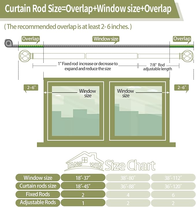 - Curtain Rods for Windows 28 to 48 inch(2.3-4ft): TANGWIN drapery rods include 2 x 16" x 1"fixed rods, 1 x 16" x 7/8"adjustable rods, 2 x finial, 2 x bracket, 1 x connector, 4 x anchor, 4 x screw. Gold curtain rods for windows can extend from 18 to 45 inches, choose the right size curtain rods according to the length of your window.
