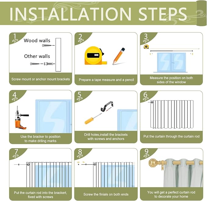 - Easy to Install Curtain Rods: TANGWIN provide detailed illustrated size instructions and modern decorative window curtains rod shipping package has detailed installation instructions inside, follow the steps, gold curtain rods can easily complete the installation.
