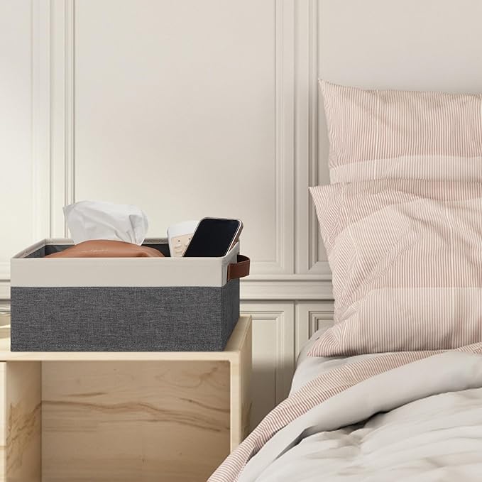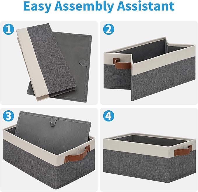 - 👍【QUALITY MATERIAL】Storage baskets for shelves are made of high-quality cationic fabric and polyester cotton fabric, and the inner layer is made of non-woven fabric, which is odorless, long-lasting and strong. Classic faux leather handles that adds a comfortable touch and provides a strong and comfort grip to pull and move. Fabric storage bin is easy to clean, just wipe with a damp sponge or cloth.