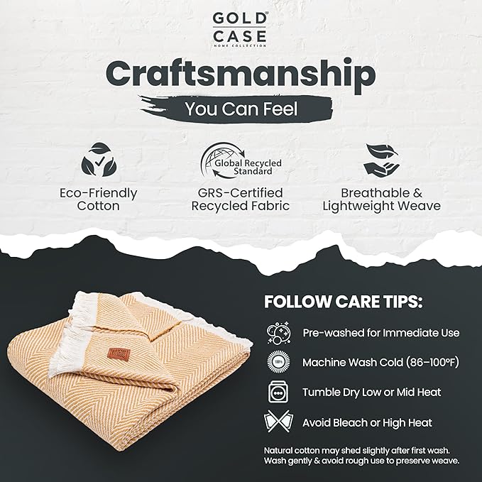 Gold Case Throw Blanket for Couch – 100% Recycled Turkish Cotton Blankets & Throws – Elegant Decorative Throw Blankets for Living Room Sofa – Woven Throws for Couch – Elegant Mustard – 60x80