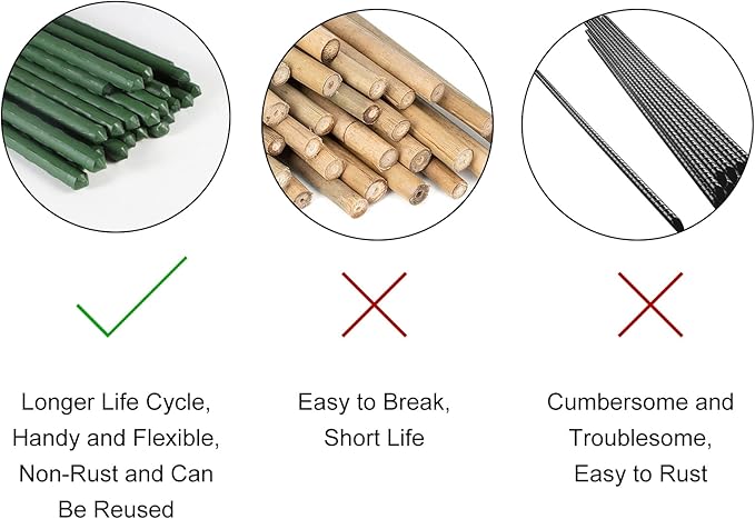 - Sturdy Garden Stakes: The garden stakes are made of sturdy hollow steel, and the surface is covered with a non-fading green plastic coating for weather and rust protection, have a longer life cycle than bamboo stakes and wood stakes, more handy and flexible than rebar and, can be reused.