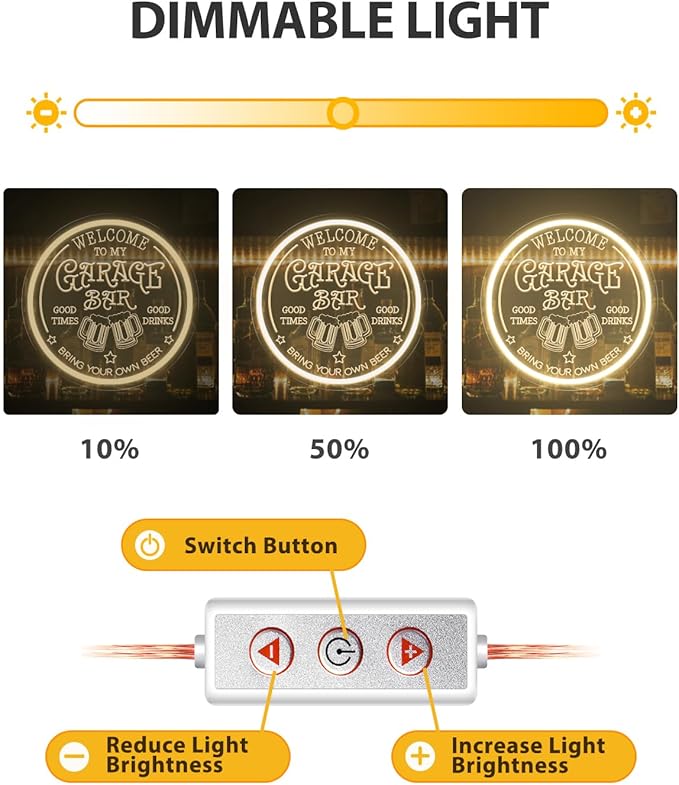 - ✨【10-Level Dimmable】Customize your led signs experience with our 10-level dimmable feature! Adjust the brightness of your neon sign to match your mood or ambiance. Whether you want a subtle glow or a bright, vibrant display, you can easily adjust it to your preference with our easy-to-use dimming controls.