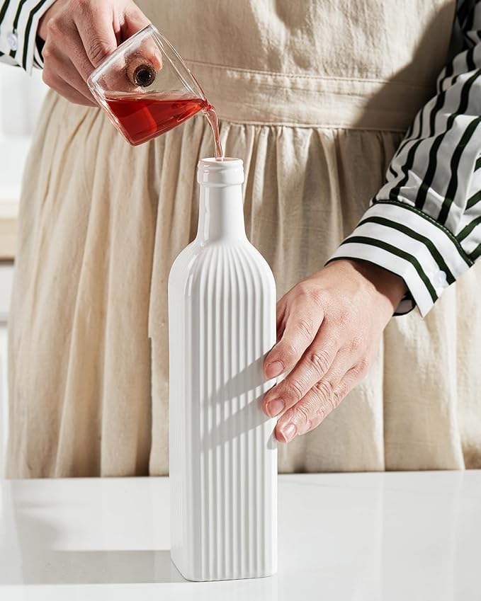 • [Elegant Design] A sleek white ceramic cooking oil dispenser with embossed stripes, creating a visually appealing and tactile experience for your kitchen or dining table