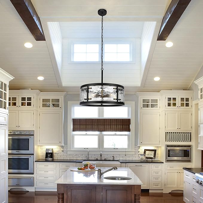 - Design: Drum chandelier is meticulously crafted by highly skilled craftsmen. The black metal frame is combined with clear waterglass to create a unique texture and depth. Gold accents add a touch of luxury, while the overall circular design provides an even and welcoming lighting effect. The clear waterglass will produce a unique light and shadow effect when the light penetrates, adding a unique charm to the interior.