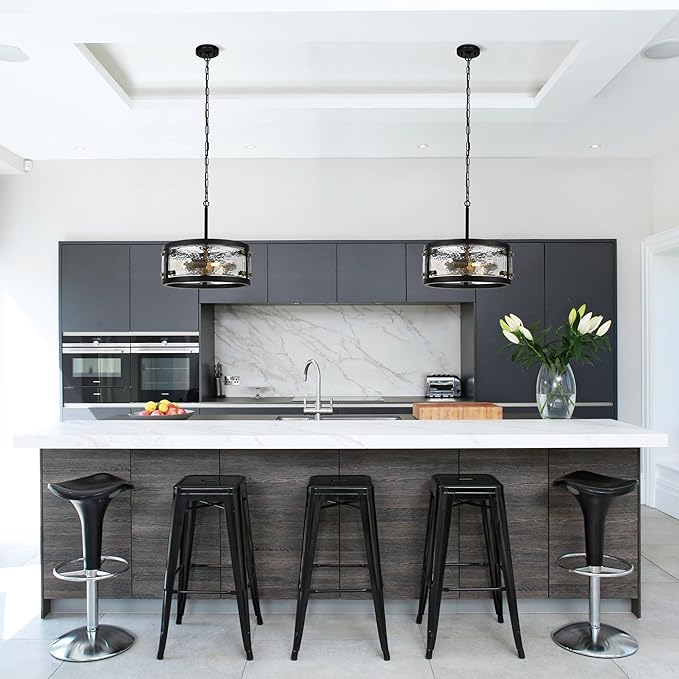 - Design: Drum pendant light is meticulously crafted by highly skilled craftsmen. The black metal frame is combined with clear waterglass to create a unique texture and depth. Gold accents add a touch of luxury, while the overall circular design provides an even and welcoming lighting effect. The clear waterglass will produce a unique light and shadow effect when the light penetrates, adding a unique charm to the interior.