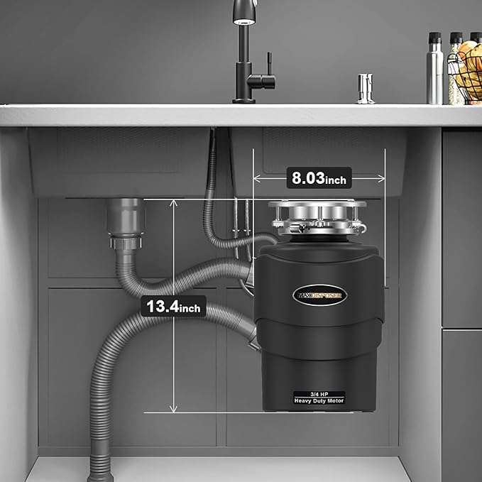 - Powerful & Plug-and-Play: ¾ HP garbage disposal comes pre-wired with power cord - simply plug into any standard outlet under your sink (no wiring needed!). Features dishwasher drain connection. Removable splash guard for easy cleaning. Size (8.03" x 8.03" x 13.64") fits most kitchens.