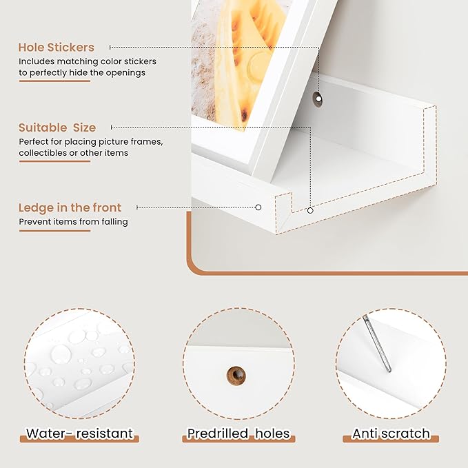 - Enhanced Stability Design: Featuring a secure lip at the front, these floating shelves prevent items from slipping or falling, confidently supporting up to 42 lbs, making these MDF wood shelves ideal for showcasing cherished items.