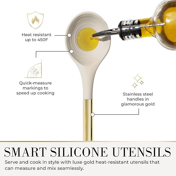 - YES, YOU CAN COOK LIKE A PRO IN STYLE! Who says function can’t look fabulous? These gold kitchen utensils blend heat-resistant silicone with chic stainless steel for tools that perform and impress. Toss that old spoon aside—this set’s got the glam gold ladle, spatula, and tongs to match your beige kitchen. Bonus? A sleek gold utensil holder keeps your counters looking Insta-ready.