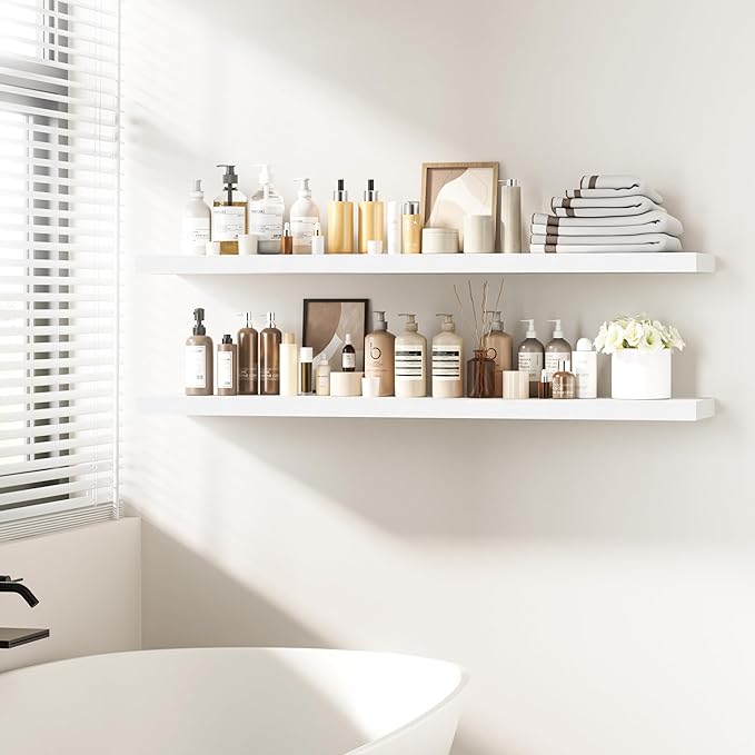 - Versatile & Multi-Scene Functionality: Our floating shelves are available in a variety of sizes and thicknesses, allowing you to choose the perfect fit for your space. Use them in the bathroom to store beauty products, hair care items. In the bedroom, they can hold books, cosmetics, and personal items. In the kitchen, they’re perfect for spices, jars, or small utensils. Or display photo frames, trophies, or collections in the living room. These shelves efficiently use wall space to create a tidier, more spacious feel in any room.