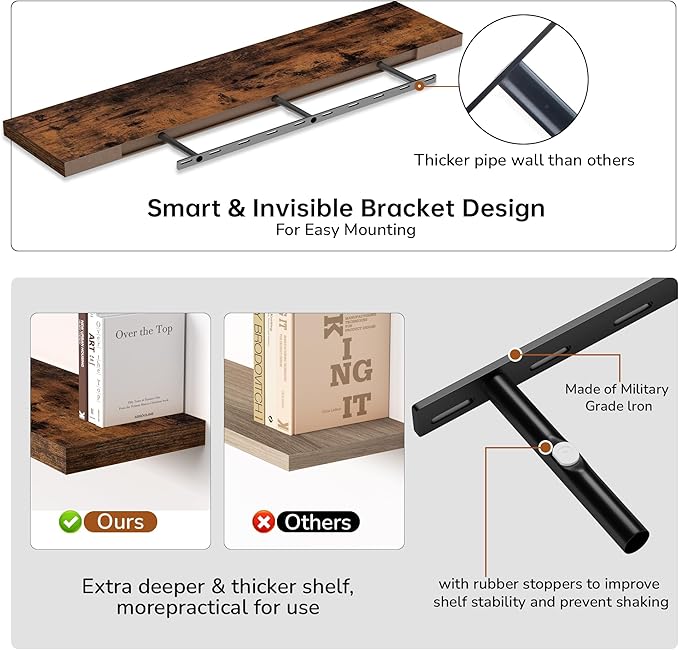 - Extra Deeper & Thicker - Each board measures 55"W x 9.3"D x 1.8"H. Extra deeper and thicker design in order to bring maximizes storage space and weight capacity, even hold up to 80 lb each. This floating shelf taking up zero square feet, reduces clutter and highlights décor in compact spaces.