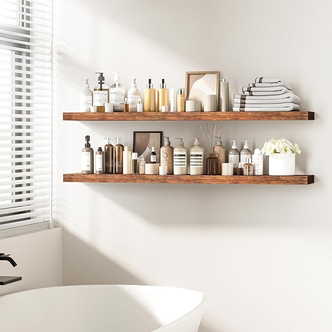 - Rustic & Modern Wooden Floating Shelves: Crafted from durable engineered wood with a realistic wood grain finish, our floating shelves offer the perfect blend of rustic charm and modern minimalism. The matte surface enhances its sleek, contemporary look, making it ideal for any room in your home. Whether you want to display your collection or organize essentials, these wall shelves seamlessly integrate with any décor and can be mounted on any wall to elevate your living space.