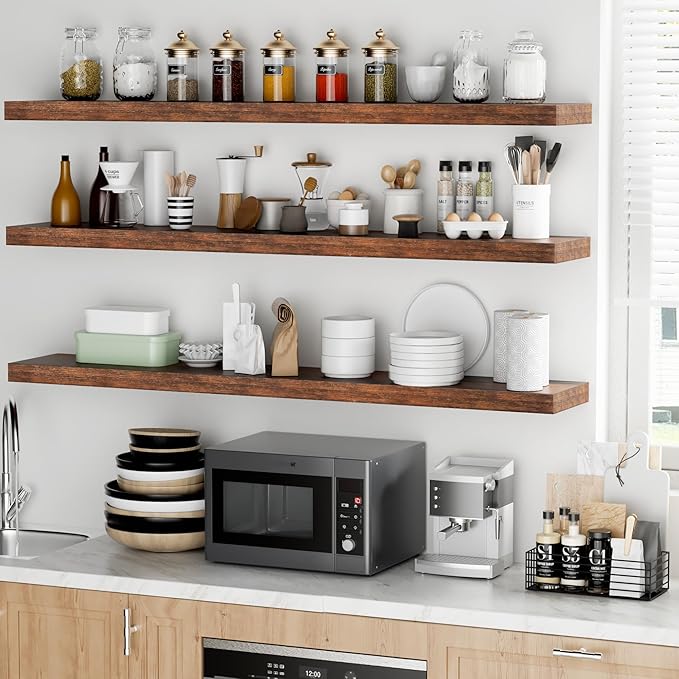 - Versatile & Multi-Scene Functionality: Our floating shelves are available in a variety of sizes and thicknesses, allowing you to choose the perfect fit for your space. Use them in the bathroom to store beauty products, hair care items. In the bedroom, they can hold books, cosmetics, and personal items. In the kitchen, they’re perfect for spices, jars, or small utensils. Or display photo frames, trophies, or collections in the living room. These shelves efficiently use wall space to create a tidier, more spacious feel in any room.