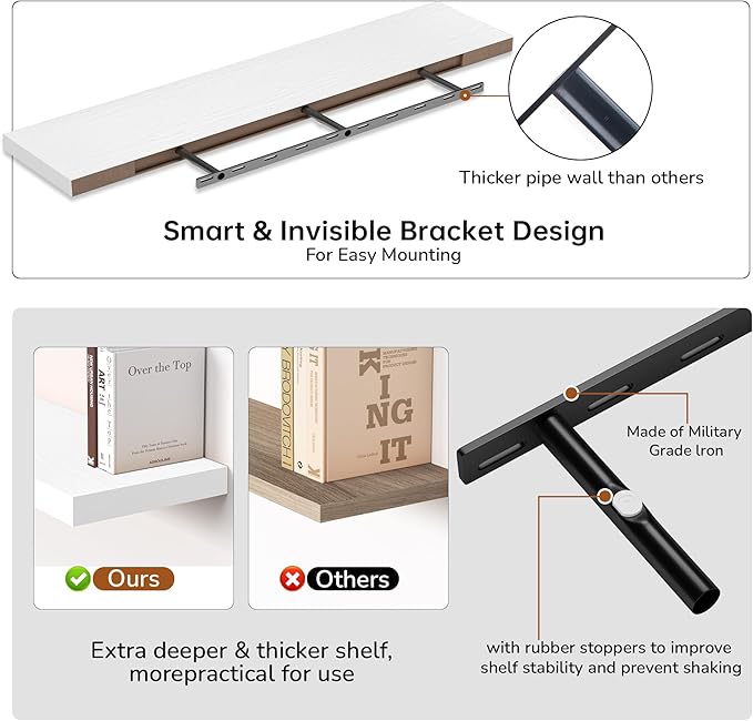 - Extra Deeper & Thicker - Each board measures 55"W x 9.3"D x 1.8"H. Extra deeper and thicker design in order to bring maximizes storage space and weight capacity, even hold up to 80 lb each. This floating shelf taking up zero square feet, reduces clutter and highlights décor in compact spaces.