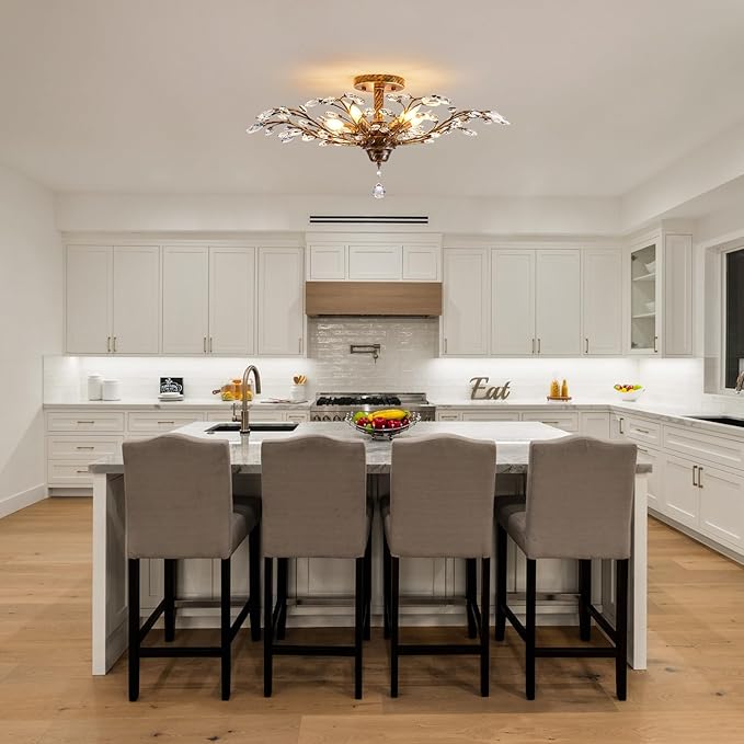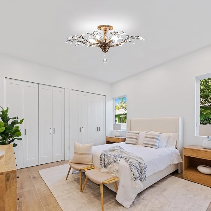- Wide Application: This vintage crystal ceiling light fixture is suitable for various spaces in your home, such as the dining room, kitchen island, living room, bedroom, bar, entryway, etc. It can also add a touch of elegance to commercial areas like office, restaurants, galleries, exhibition rooms, and coffee shops. Its stylish design complements a range of interior styles.(Note: The 5-head ceiling light chandelier can only be used on flat ceilings.)