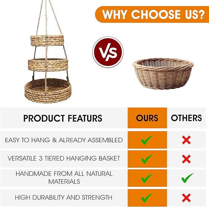 • Versatile Hanging Basket: Set of 3 woven baskets designed for hanging storage of fruits, vegetables, kitchen supplies, and more.