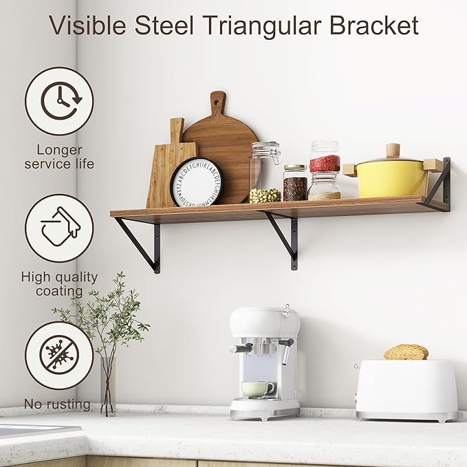 - 【FARMHOUSE RUSTIC WALL SHELF】These floating shelves are made of premium engineered wood board and visible triangular bracket. The rustic wooden grain surface add character and warmth to any modern or traditional interior with these deep floating shelves, contrast shelves at staggering heights on the wall or mount side-by-side or in the corner for a clean streamlined look.