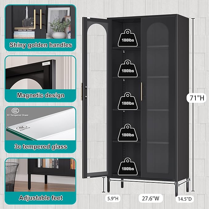 - 【Glass Door Bookcase】This 71" tall glass cabinet features two upgraded tempered glass doors, providing a clear view of your books and collectibles. The transparent tempered glass allows you to quickly locate your favorite books or display items without opening the doors. The sleek design is complemented by shiny golden door handles, adding a touch of elegance to any room. The glass doors are easy to clean, ensuring your bookcase always looks pristine. An excellent choice for upgrading home and office
