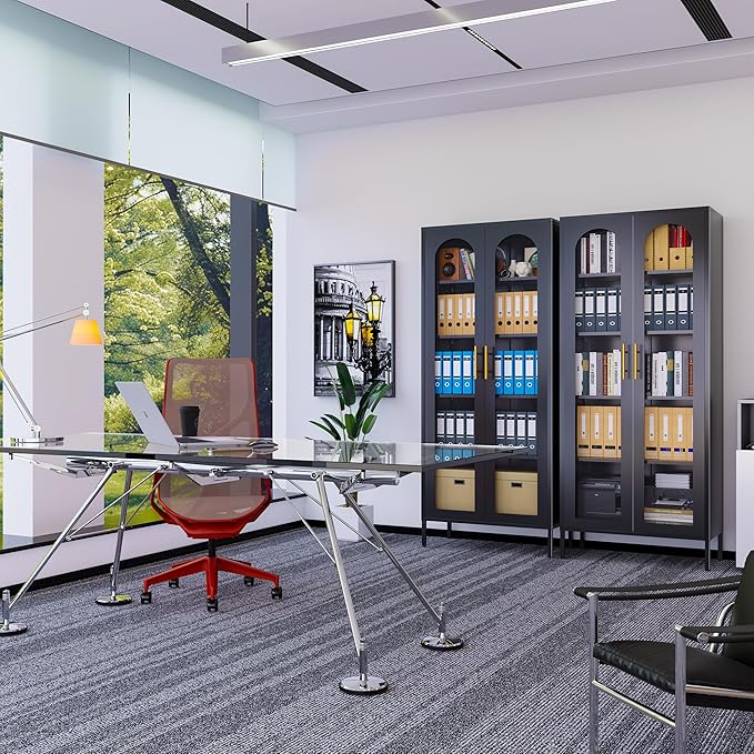 - 【Modern and Versatile Design】With its contemporary style, this metal bookcase seamlessly blends into any decor, whether it's a modern office, a cozy living room, or a stylish bedroom. The combination of metal and glass creates a timeless look, while the glass doors add a touch of sophistication. Use it as a bookshelf, display cabinet, or pantry organizer—this bookcase is as versatile as it is beautiful.