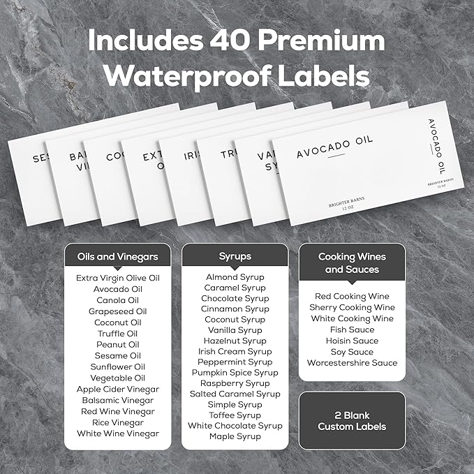 - AMERICAN DESIGN, UNCOMPROMISING QUALITY โ Crafted with meticulous attention to detail, our cooking oil dispenser set features shock-resistant glass, 40 premium waterproof labels, and high-quality weighted 304 stainless steel spouts that automatically close to preserve freshness and prevent messes. All designed in the USA to provide unbeatable quality and enduring style that you can trust.