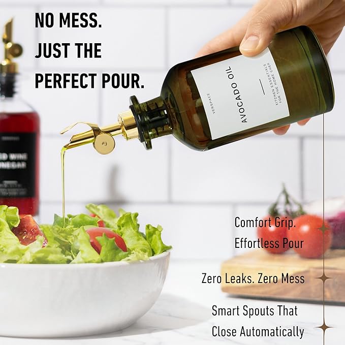 Green Glass Olive Oil Dispenser Bottle For Kitchen By Verpsace,Avocado Oil Dispenser Set, Modern Decor, Gold Kitchen Accessories for Home, Airbnb, Cafe (Gold, Set of 2)