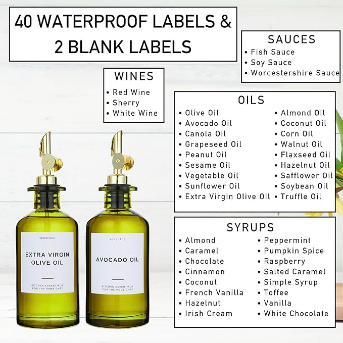 - THE ULTIMATE OIL BOTTLES FOR KITCHEN ORGANIZATION: Designed for minimalists and modern chefs, this oil dispenser for kitchen includes 2 bottles, 2 drip-free stainless steel spouts, a funnel, and 42 waterproof labels. Everything you need for a clutter-free, chic cooking space.