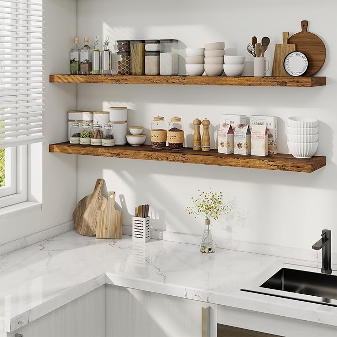 - Timeless Design for Any Room: Elevate your décor effortlessly! The classic retro texture of these floating shelves complements bathroom, bedroom, kitchen, living room or even office space. Neutral tones blend with existing furniture, adding warmth without clashing