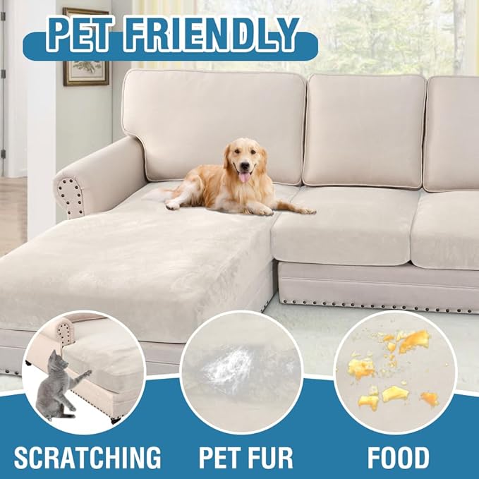 - INCREDIBLY COMFORTABLE VELVET: Products passed GLOBAL RECYCLED STANDARD certificate.This innovated stretch sofa slipcovers are constructed with 3 PIECES,including 1 Chaise cover and 2 individual cushion covers. Crafted from luxurious velvet plush fabric, feature thick, soft, smooth, anti-wrinkle, no fading, durable as well as highly stretch. Protect your cushion furniture from daily wears and tears, stains, kids, scratches from pet claws, dogs or accidental spills