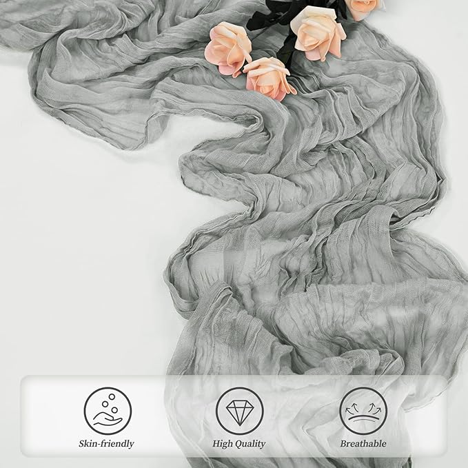 - Cheesecloth Table Runner Size: You will receive 12 gray cheesecloth tablerunner, each measuring 20 x 120 inches. The quantity is sufficient for you to decorate various romantic occasions. It can decorate most shaped tables, such as rectangular tables, round tables, and cocktail tables. It is long enough to decorate a large table and be placed perfectly and elegantly on the tabletop, adding a romantic atmosphere to your occasion.