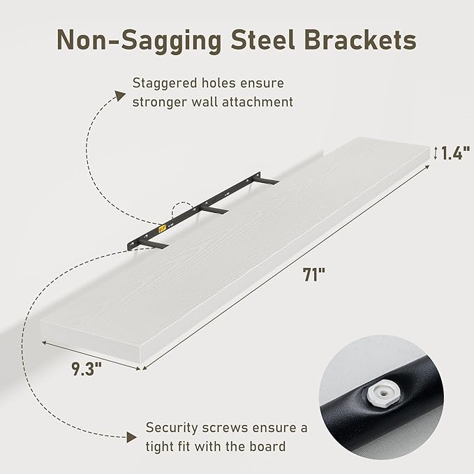 - 72 Inch Floating Shelves for Wall (Set of 2): Each wall shelves are 9.3 inches in depth and 1.4 inches in thickness. 2-piece set is more cost-effective and practical. Our wall shelf can be used in combination, staggered high or low on the wall, or mounted side-by-side to provide extra storage space for organizing small items and clutter in multiple areas such as kitchens, bathrooms, and bedrooms, creating a clean and smooth look. Multiple colors available