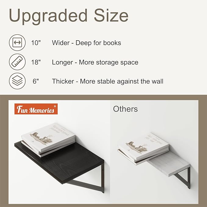 - 【10 INCH DEEP FLOATING SHELF】This extra deeper and wider wall shelves are 10 inches in depth and 18 inches in length instead of the regular narrow floating shelves, you can put photos, pictures, DVD players, videos, books, toys, and some other knickknack on this beautiful display wooden shelf.