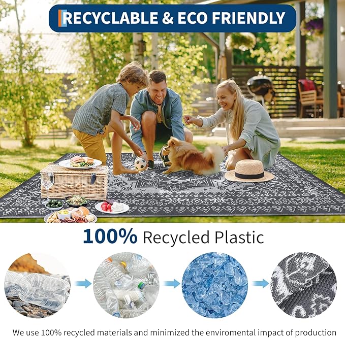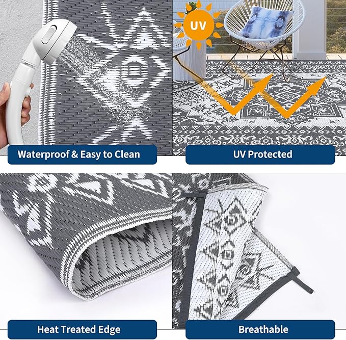 - Durable & Comfortable: Made from premium recycled plastic straws, the outdoor mat is waterproof, UV-resistant, and fade-resistant. Heat-treated, anti-fray stitched edges ensure long-lasting use, while the soft surface feels great under bare feet
