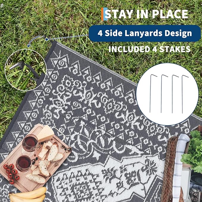 - Portable & Versatile: Lightweight and foldable, this waterproof camping rug comes with a handy carrying bag, making it perfect for road trips, RV adventures, picnics, or beach outings. Easily store or move it whenever you need extra style or comfort