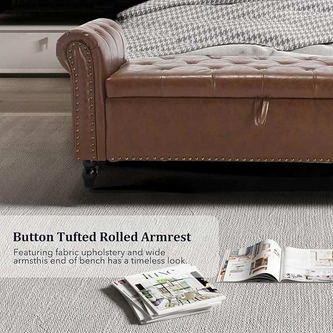 Furniliving 55” End of Bed Bench, Bedroom Bench with Button-Tufted, Large Upholstered Storage Ottoman Entryway Bench with Storage Shoe Cabinet Bench, for Bedroom, PU, Brown