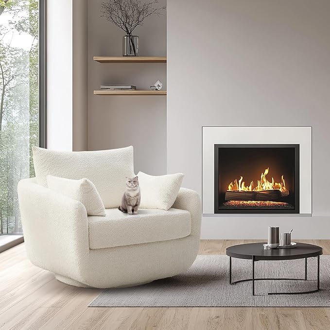 360° Swivel Accent Armchair, 39.3" Oversized, Sherpa Boucle Fabric Sofa Chair with Removable Back & Arm Pillows, Swivel Chair with Cozy Soft Padded, No Assembly Required (1, Cream White)
